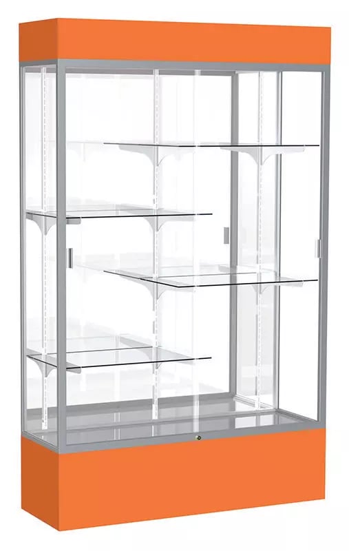 The Spirit Case matches the case series with your school colors! These classically designed cases combine the strength and durability of aluminum with the beauty of vivid school colors. Anodized aluminum frames secure sliding tempered glass doors. Backing is offered in 8 different colors. Aluminum framing is available in Dark Bronze, Satin, or Champagne anodized aluminum, and a mirror or plaque back. Features sliding tempered glass doors and four 14" deep half shelves with brackets. All cases are 16"D. Includes built-in locks and leveler. Available unlighted or with lighted cornice. PLEASE SPECIFY COLOR, CASE BACK, AND BASE COLOR WHEN PLACING AN ORDER.