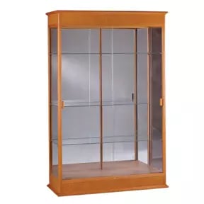 Cases feature solid oak and oak veneers for a traditional furniture look. Varsity cases have a built-in cornice lighting and decorative cove moldings. Case sides and doors have tempered glass. Varsity Series cases feature recessed door locks for security and built-in levelers for easy installation. Comes with 3 full-length adjustable glass shelves and steel shelf brackets. Choice of sliding or hinged doors. Dimensions: 48" x 77" x 18". Back panel Mirror or Plaque Fabric. PLEASE SPECIFY COLOR WHEN ORDERING.